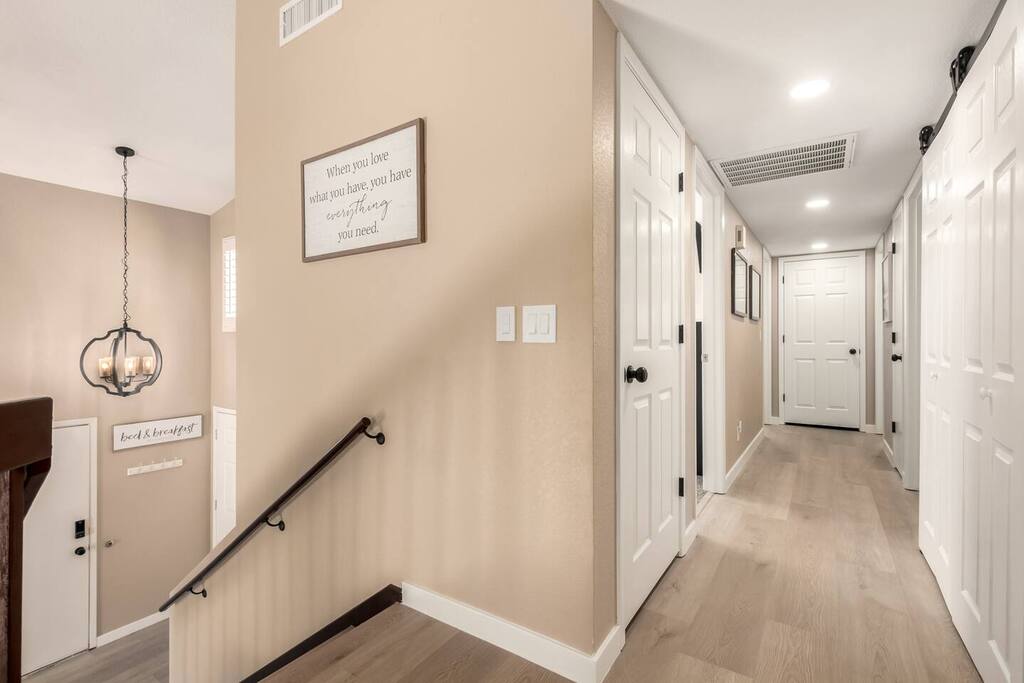 This spacious tri-level 6-bedroom, 3-bathroom home is designed for comfort, connection, and relaxation. The main floor features a cozy family room and access to the garage. Upstairs, you'll find the master suite with a private bathroom, two additional bedrooms, a shared bathroom, a fully equipped kitchen, and laundry. The bottom level includes 3 more bedrooms, a second living room with a sectional and exercise equipment, and another full bathroom. Every bedroom has a smart TV and a small desk for remote work. Outside, enjoy a pool, BBQ grill, and outdoor seating with pool noodles. Located in a quiet, family-friendly neighborhood just minutes from top-rated East Mesa hiking trails and stunning views of Superstition Mountain.