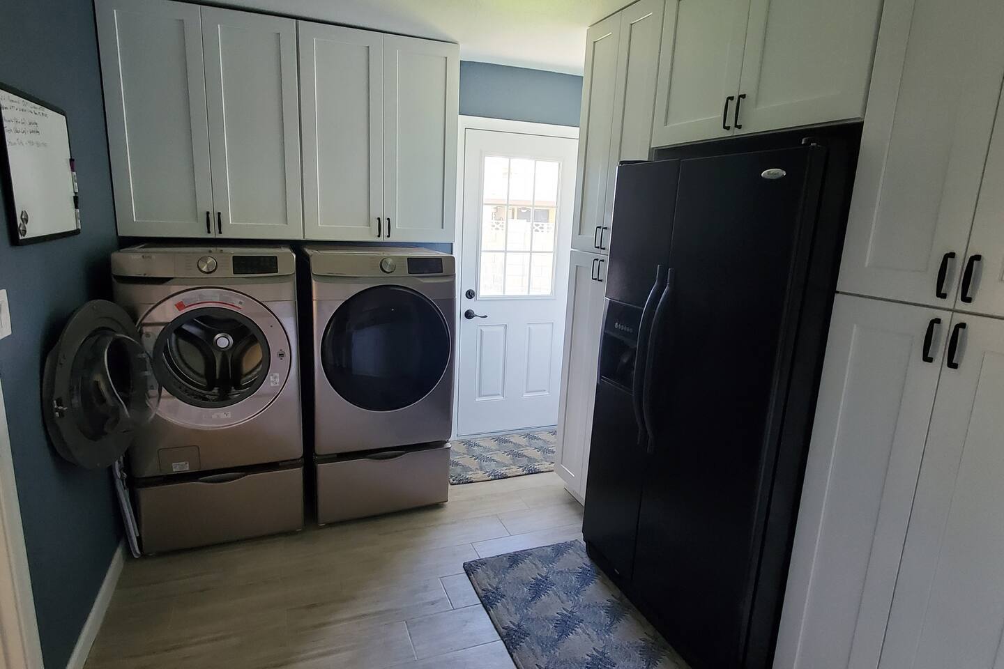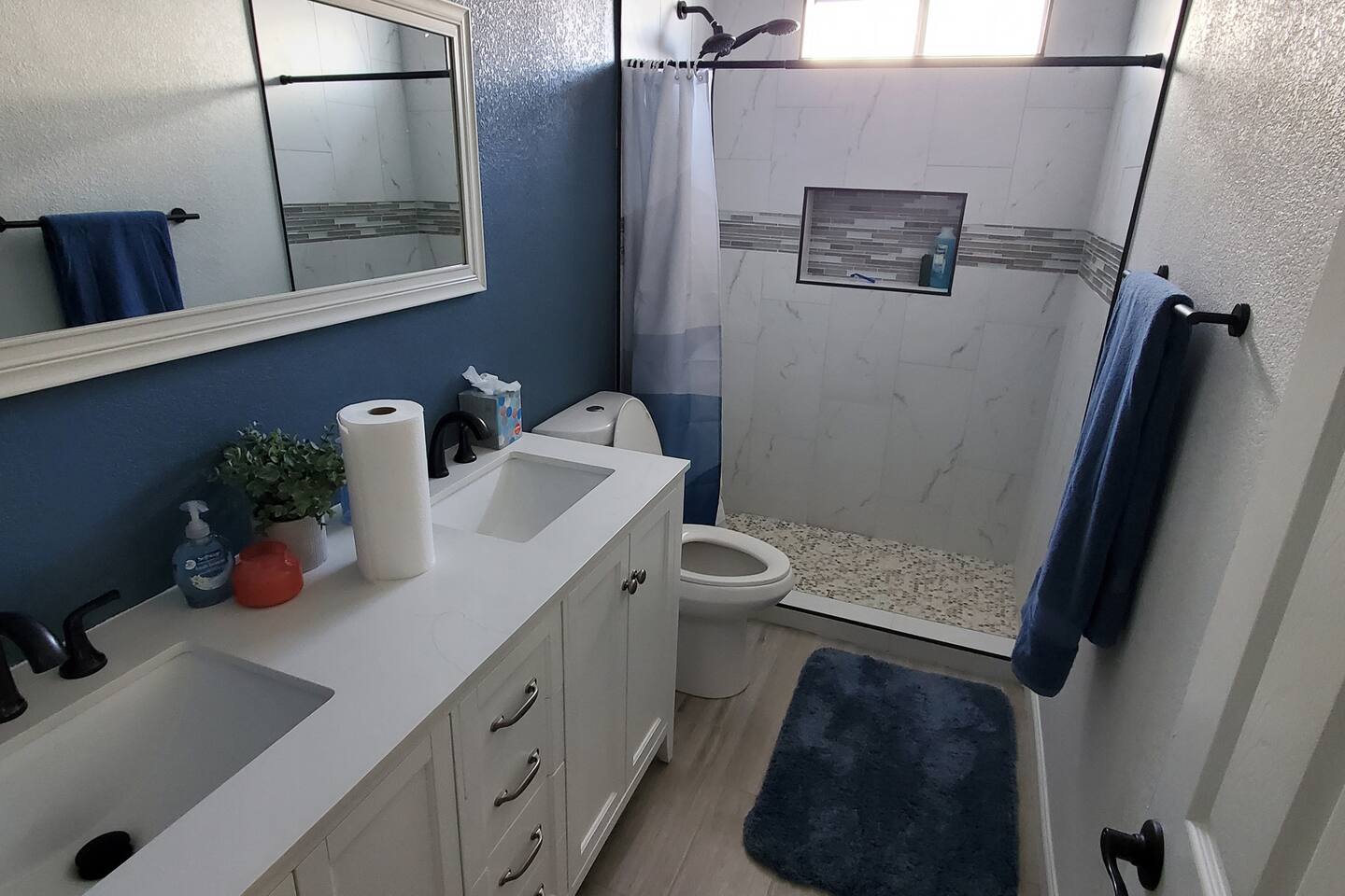 The house is a 5 bedroom, 3 bathroom, 2,250 sqft basement home. There's two rooms upstairs and three rooms downstairs. 1 shared bathroom upstairs and 1 shared bathrooms downstairs. Everything in the house has been completely renovated including all the bathroom, floor, kitchen, AC, doors, stairs, etc. This room is located downstairs in the basement and shares a bathroom with three rooms.