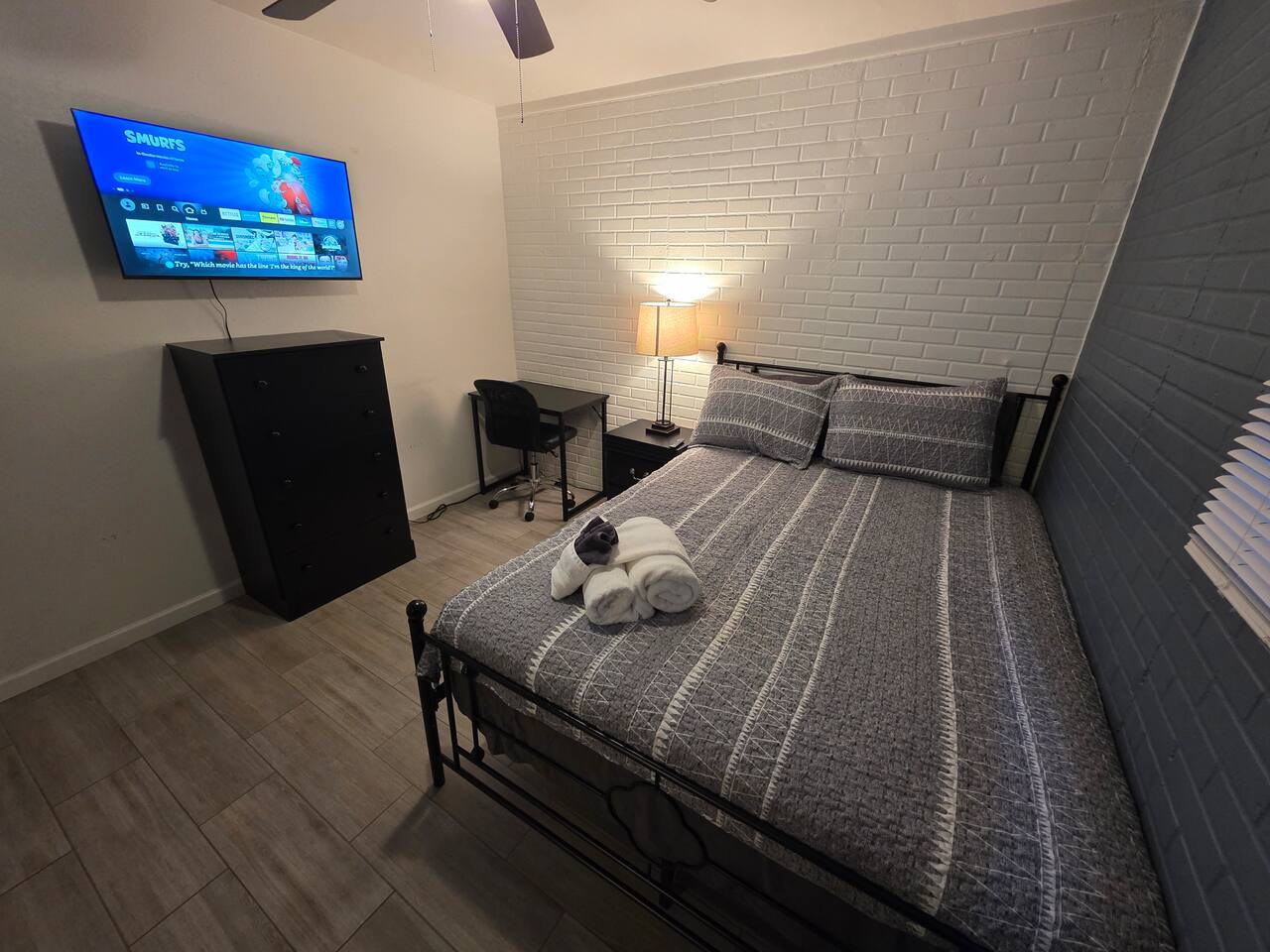 Cozy fully furnished basement room in a quiet Mesa neighborhood. Features a queen bed, private TV, and blinds for comfort and privacy. Shared bathroom kept clean and well-maintained. Guests have full access to a fully equipped kitchen with plenty of storage space for groceries. Conveniently located near dining, shopping, and major highways, making it perfect for work, school, or leisure stays. Fresh linens and free street parking included.