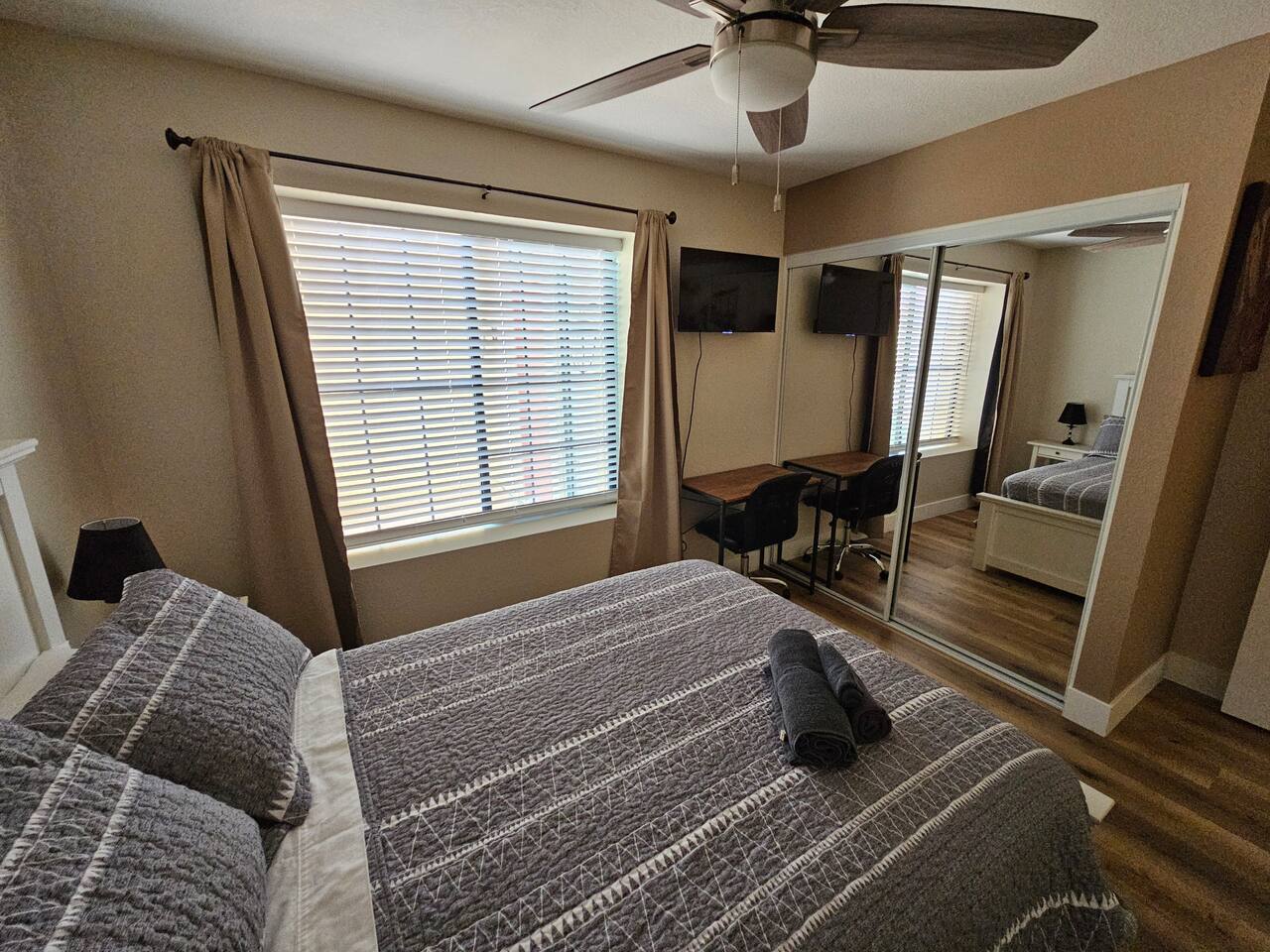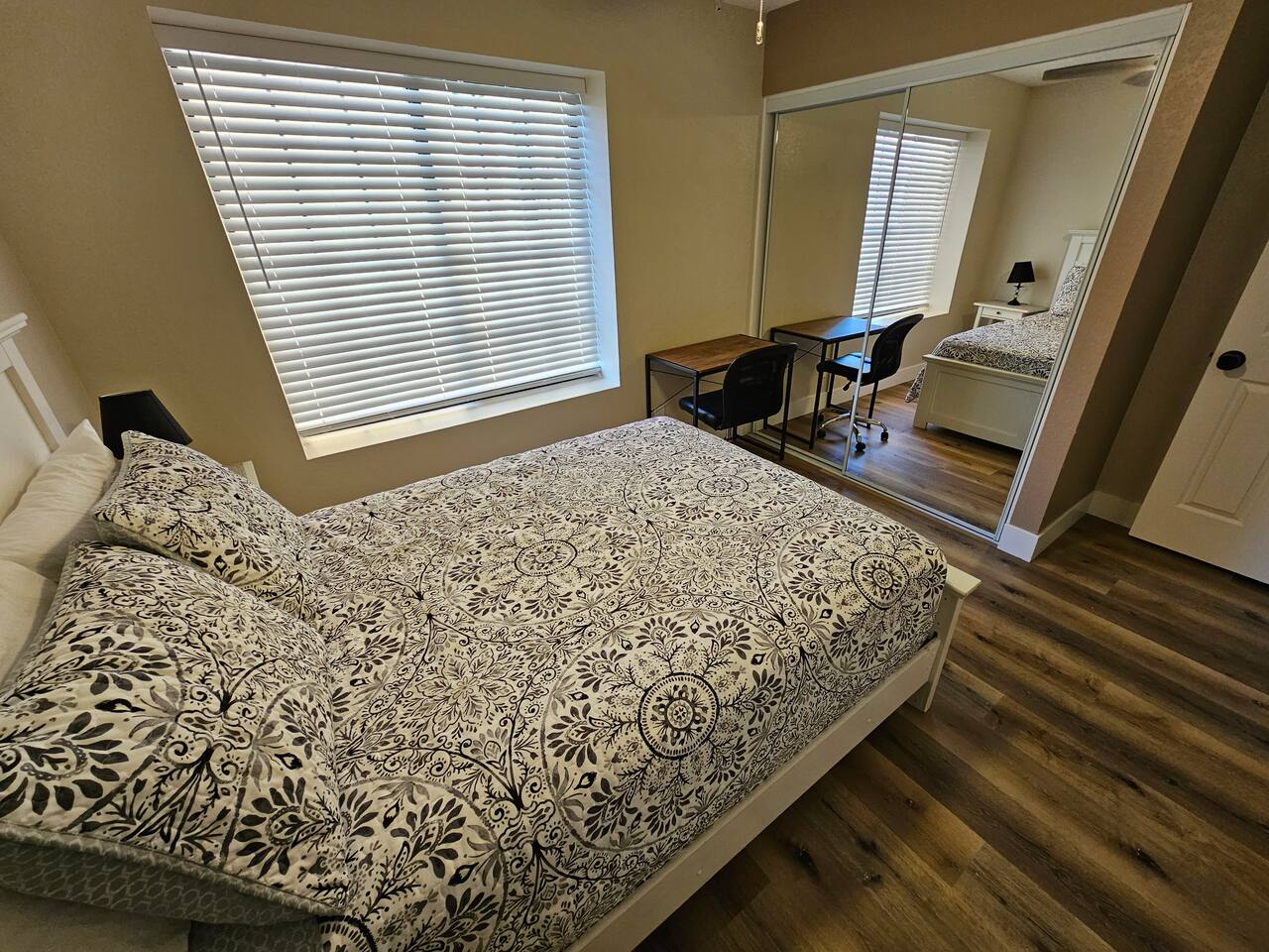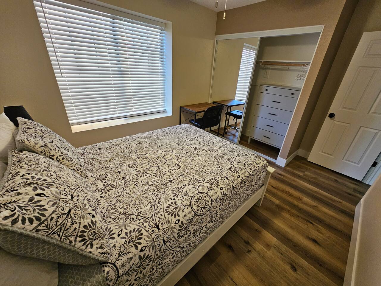 The house is a 6 bedroom 3 bathroom property and this room would share a bathroom with three other guests. The room comes with a dedicated electronic lock on your door to ensure you're private space is 100% private. The only other person who would have a code is the host and would only use it in emergency situations. Each room comes with a dresser, desk, chair, nightstands, lamps & the bed. The closet are mirrors will have hangers so you can hang clothes as well. The rooms are professionally cleaned prior to each stay. You'll also have access to the rest of the house which includes a family room, living room, dining room, kitchen & laundry room. These areas are shared among the guests and is professionally cleaned every other week. The kitchen is fully stocked with all the appliances & accessories needed to cook a meal. The living room has a 70 inch TV & the family room has a 55 inch TV both have Netflix, Hulu, Amazon Prime, Disney +, Paramount & HBO all included!