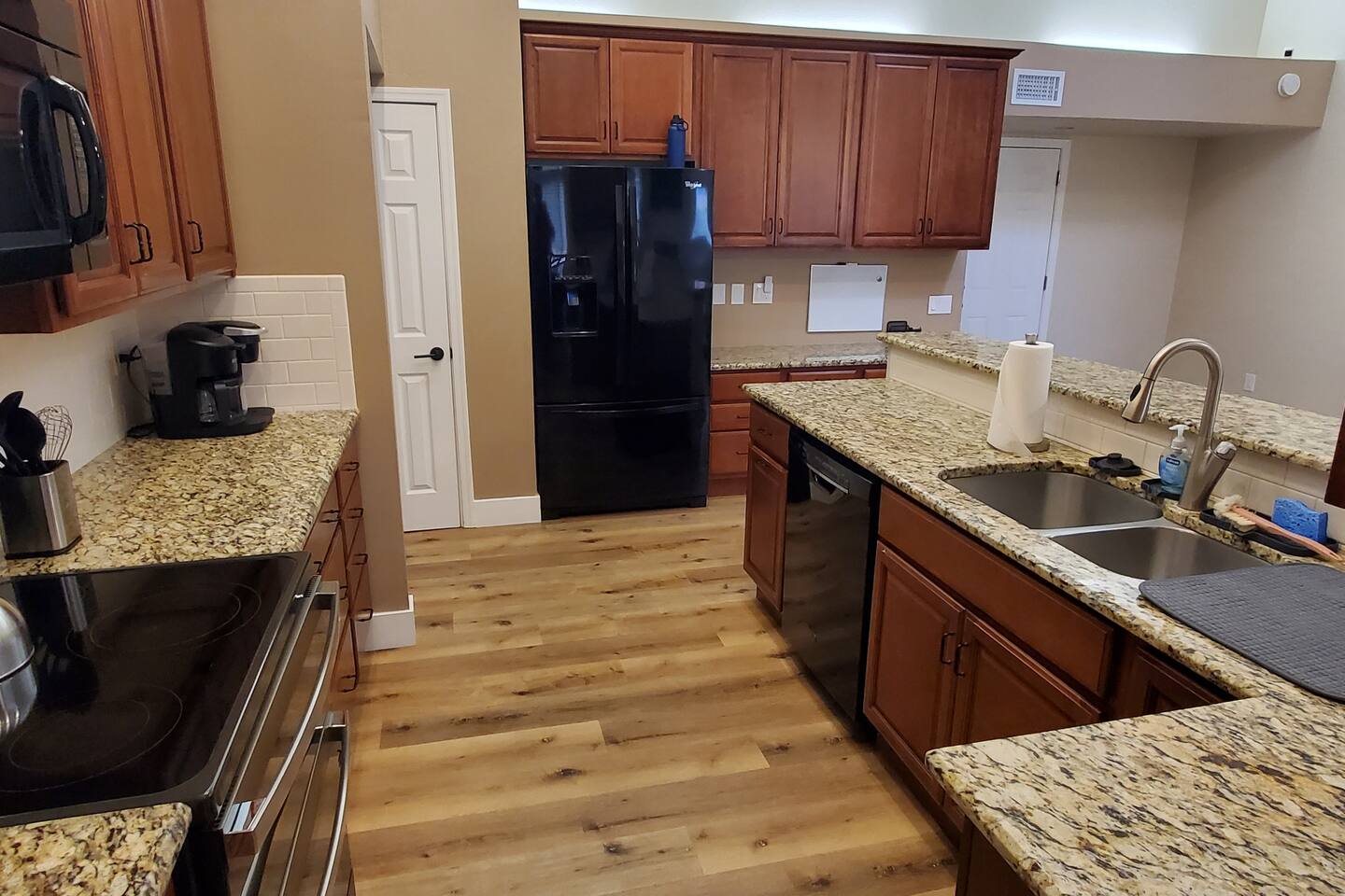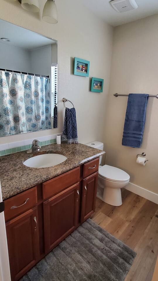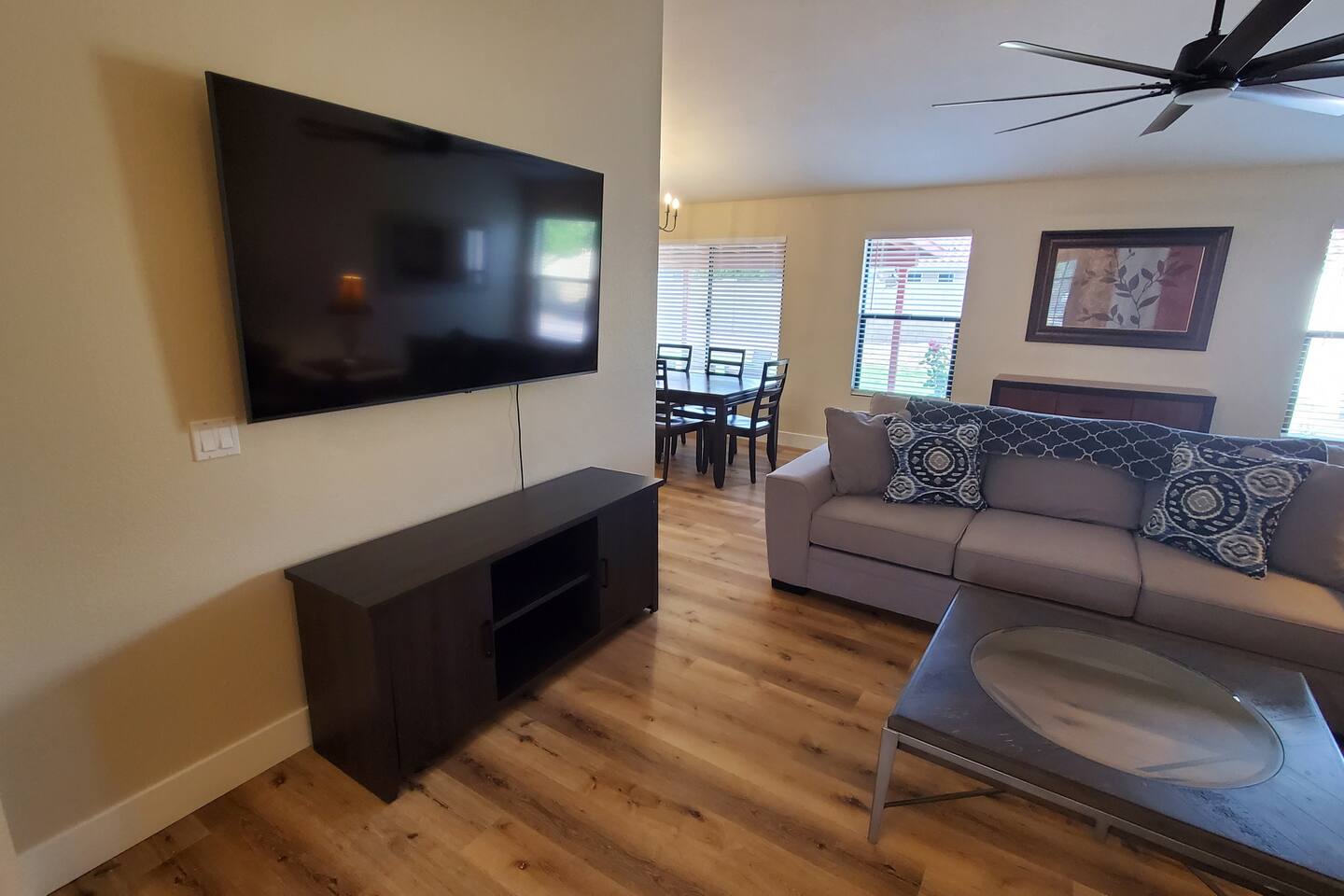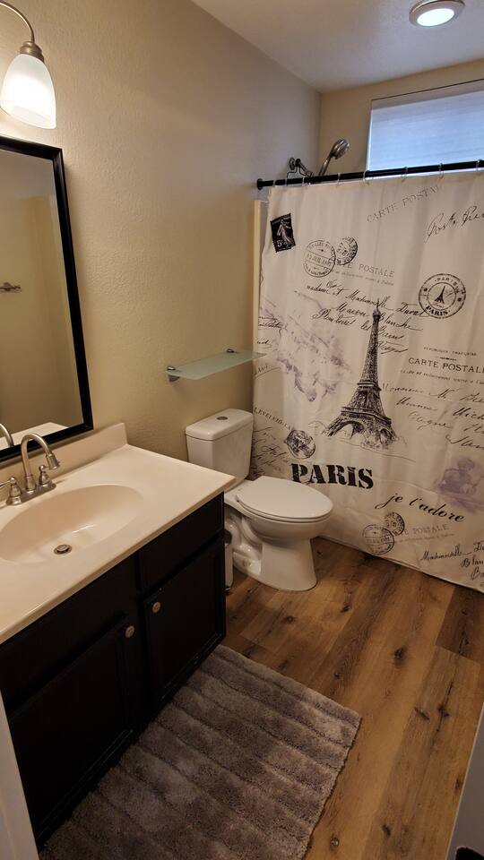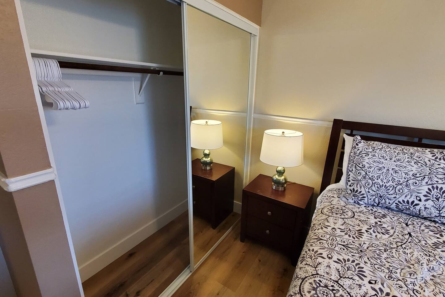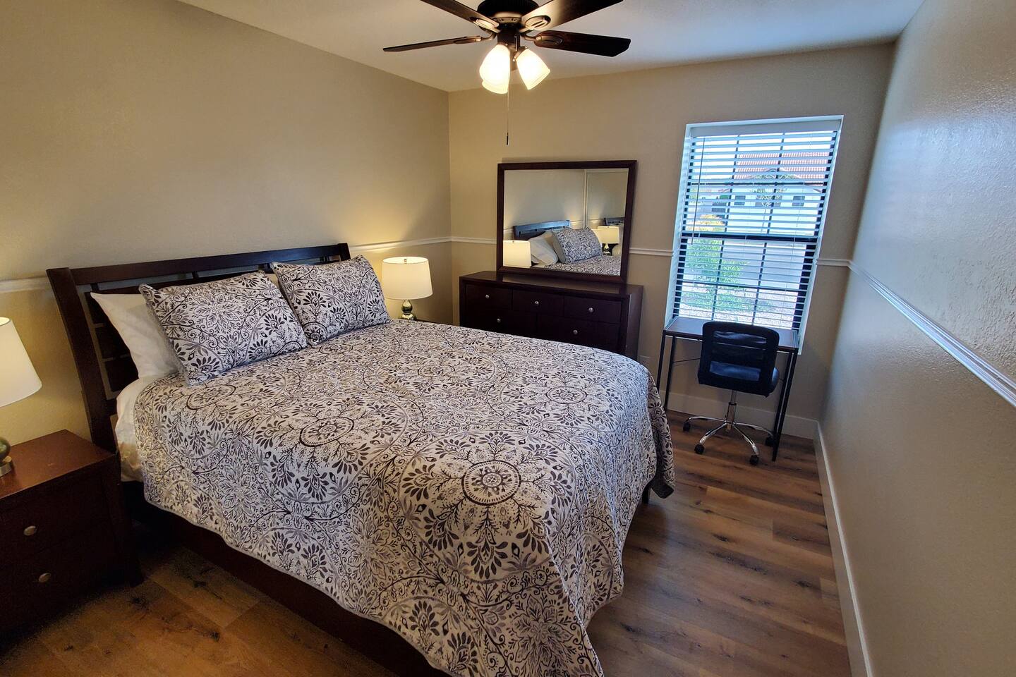 The house is a 6 bedroom 3 bathroom property and this room would share a bathroom with three other guests. The room comes with a dedicated electronic lock on your door to ensure you're private space is 100% private. The only other person who would have a code is the host and would only use it in emergency situations. Each room comes with a dresser, desk, chair, nightstands, lamps & the bed. The closet are mirrors will have hangers so you can hang clothes as well. The rooms are professionally cleaned prior to each stay. You'll also have access to the rest of the house which includes a family room, living room, dining room, kitchen & laundry room. These areas are shared among the guests and is professionally cleaned every other week. The kitchen is fully stocked with all the appliances & accessories needed to cook a meal. The living room has a 70 inch TV & the family room has a 55 inch TV both have Netflix, Hulu, Amazon Prime, Disney +, Paramount & HBO all included!