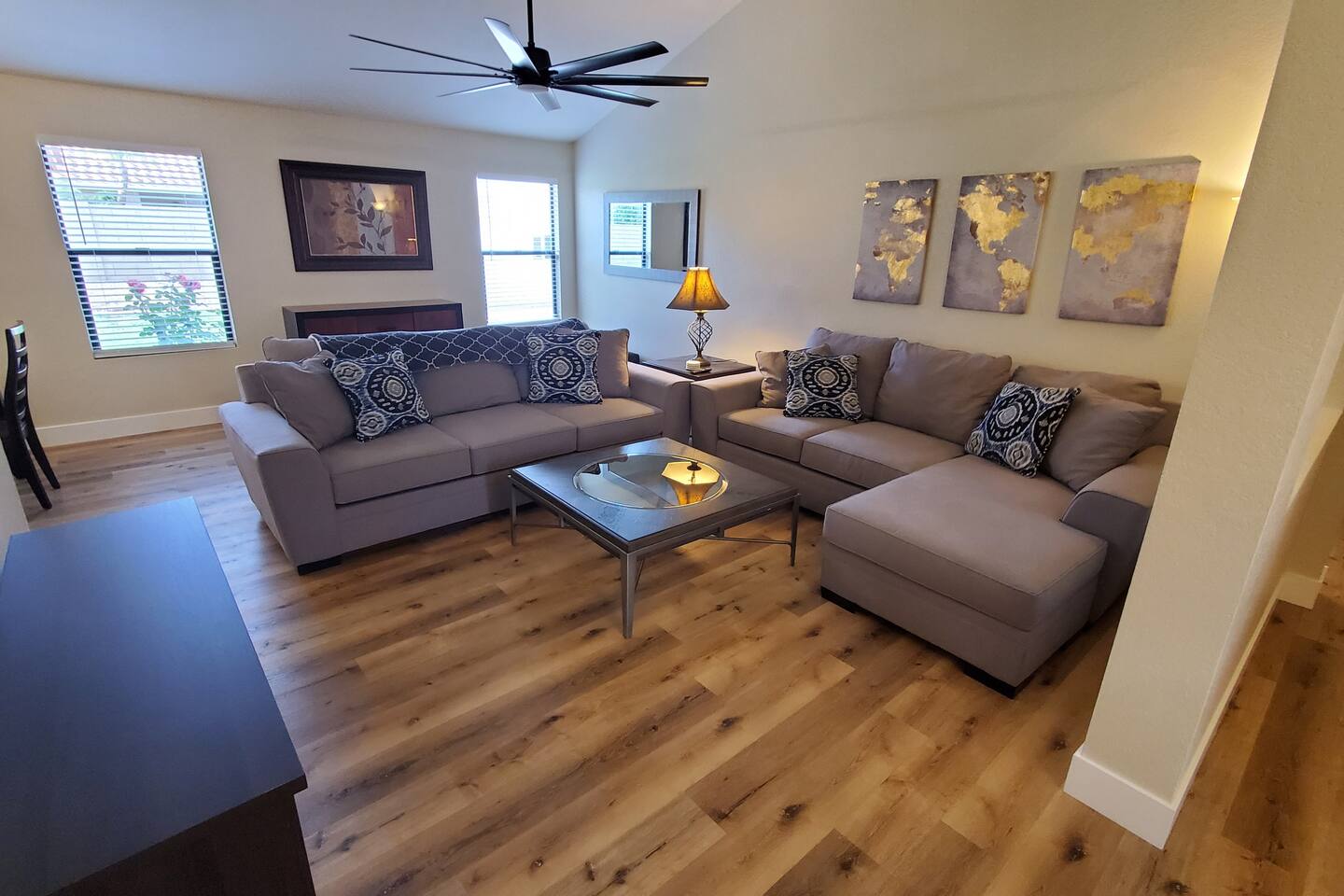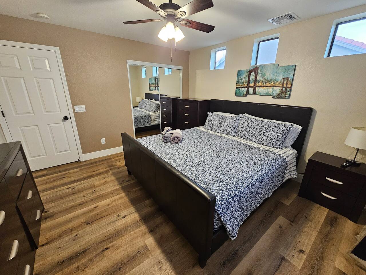 The house is a 6 bedroom 3 bathroom property and this room would share a bathroom with three other guests. The room comes with a dedicated electronic lock on your door to ensure you're private space is 100% private. The only other person who would have a code is the host and would only use it in emergency situations. Each room comes with a dresser, desk, chair, nightstands, lamps & the bed. The closet are mirrors will have hangers so you can hang clothes as well. The rooms are professionally cleaned prior to each stay. You'll also have access to the rest of the house which includes a family room, living room, dining room, kitchen & laundry room. These areas are shared among the guests and is professionally cleaned every other week. The kitchen is fully stocked with all the appliances & accessories needed to cook a meal. The living room has a 70 inch TV & the family room has a 55 inch TV both have Netflix, Hulu, Amazon Prime, Disney +, Paramount & HBO all included!
